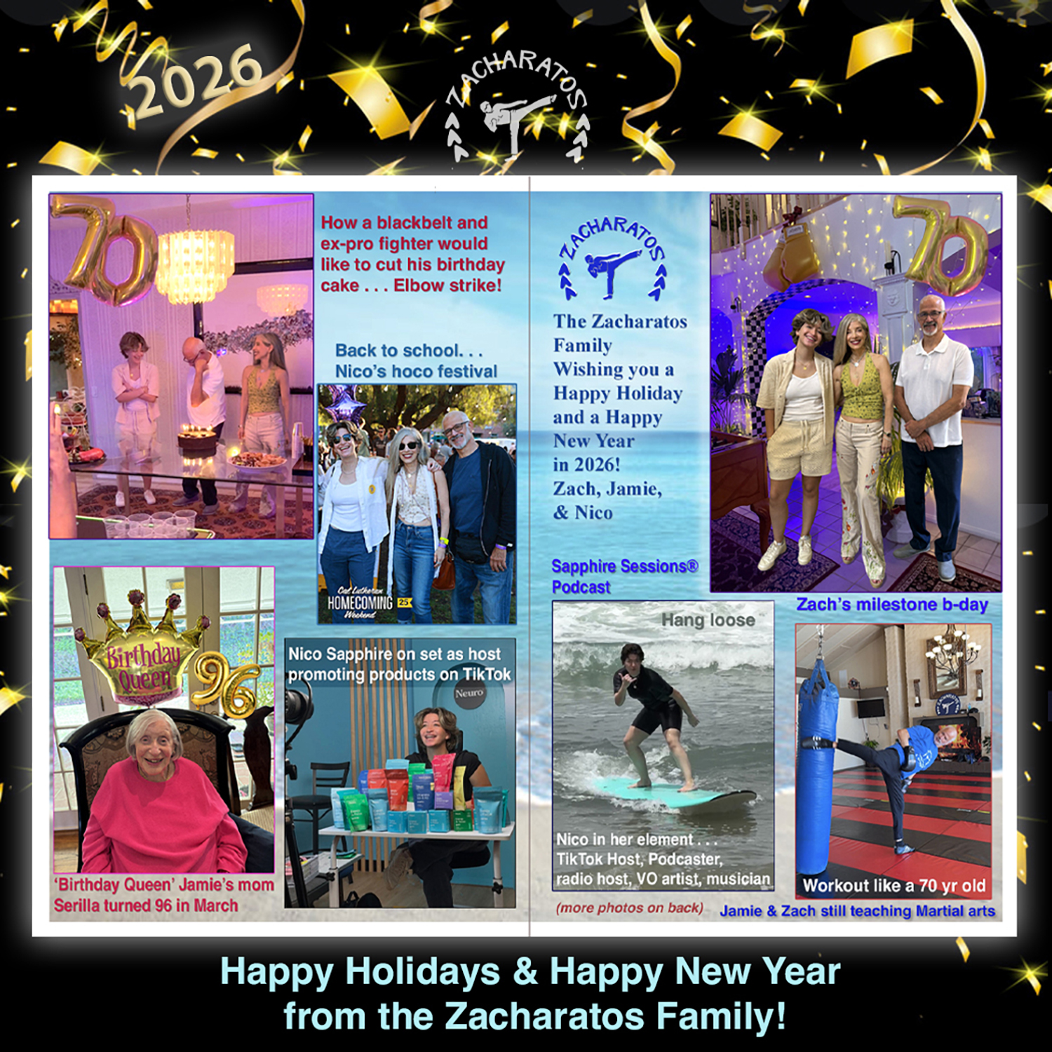 I added the festive holiday ribbons and our karate business logo, to post on our karate website and instagram for a more glam look out of our usual karate gear!
