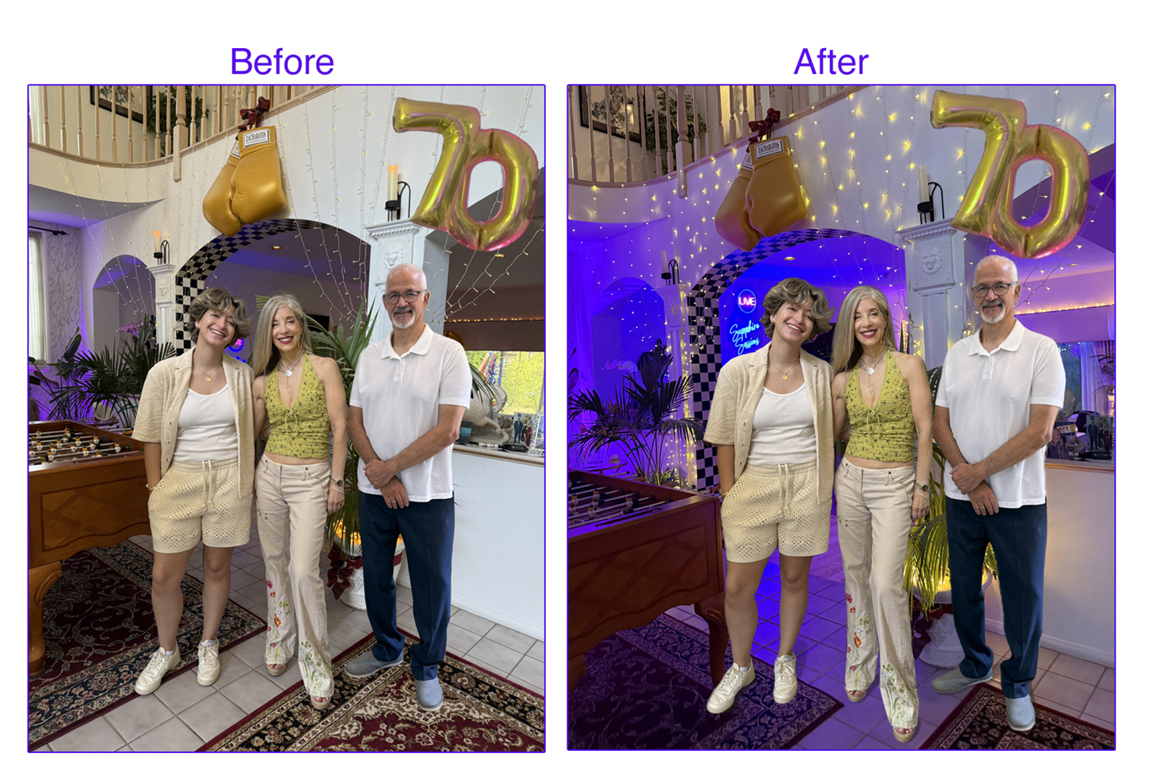 For this year’s annual holiday card, my main photoshopping trick was with our family group cover shot. We had a party for my husbands 70th, but when we took the group photo it was daytime, and I really liked how the lights showed up better at night. First I added my husband to this photo, since he took the photo of me and our daughter, and I took a photo of him separately. Then to put us in the night background, I put on all my party lights, (colored up lights, drapery twinkle lights etc), and took a photo at night of the room at the same angle as the daytime photo. Then I separated ourselves from the daytime photo and put us in the night time background photo. We started to look a little floaty, so I put shadows on our feet and that helped. To separate us from the original photo, the remove background tool for people didn’t work completely, it also took out parts of hair on the head etc, so I could use it for parts of the body which saved time, and what ever parts were missing, I had to separate us the tedious way with the lasso tool, outlining us and deleting the background, and pasting it to the parts that were missing with the remove background tool.