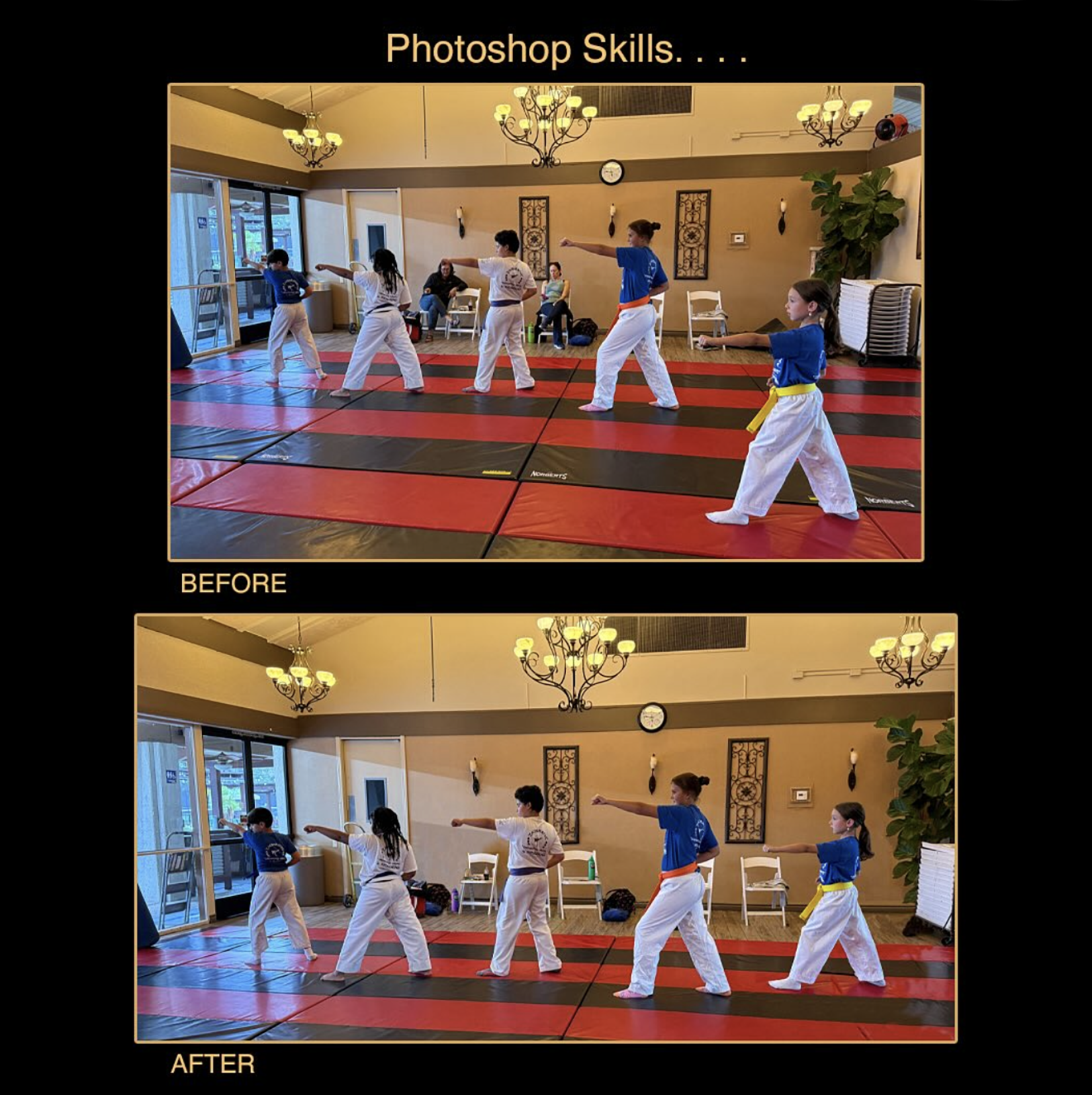 In this before photo, as you can see, one girl was not in line with the others, what a project to mover her! A combination of remove background tool (which also removes parts of the person, usually the parts of the hair) and the lasso tool to outline and delete background for missing parts by the remove background tool, then I isolated the girl from the background and moved her back in line, and sized her to fit. But I had to recreate the background she covered in the first photo with the plant and folding chairs on the right, and I had to remove the parents sitting in the back and recreate the chair parts covered by them when they were sitting. There’s no one tool yet that can do this with one quick touch of a button, it requires skill and attention to detail by an artist (me). It sure would have been simpler if our karate student was in line with the others in the first place! The fine art meets the martial arts once again!